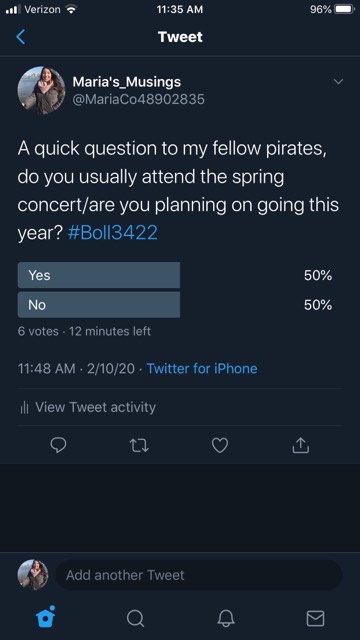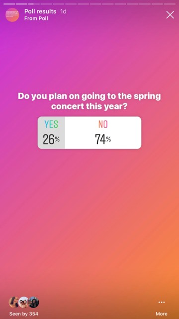 First, I needed to know if students usually attended the Spring Concert or were planning on going this year. This was important because it would help me determine if my observation was right that attendance at this event was drastically dwindling over the years, and if the reputation of the event was affecting potential turnout for this year. Responses to my Twitter poll showed that 50% of those who answered said that they usually attend the spring concert and planned on doing so this year, while the other 50% did not.