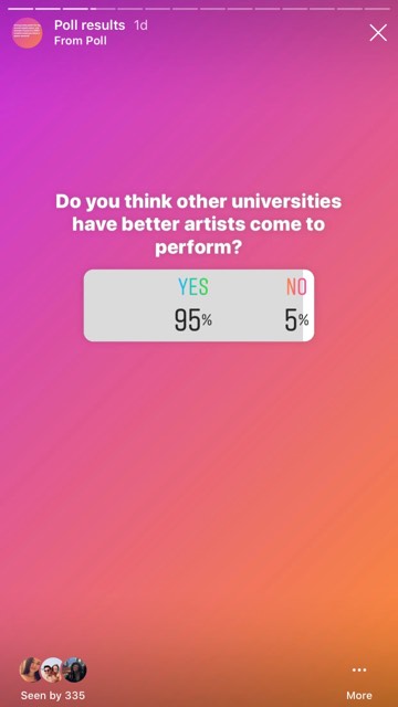 From my personal experience I’ve always thought that other universities had far better Spring Concerts and wondered why Seton Hall couldn’t do the same. I wasn’t sure if this was just personal preference or campus wide opinion, so I decided to take that question to the Instagram polls as well.